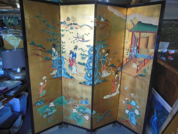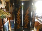 72''H x 4 @ 18''W Asian Four Panel Screen w/Painted Scene on One Side, Gold Bamboo on Black Lacquer on One Side.
