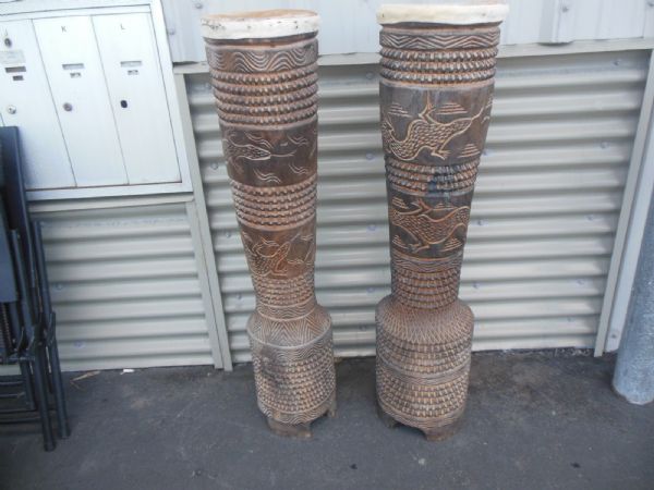 SET OF TWO - Carved 40''H Bongo Drums w/Hide Heads.
