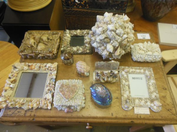 Shell covered boxes, frames, glass boxes with shell tops, shell ball.