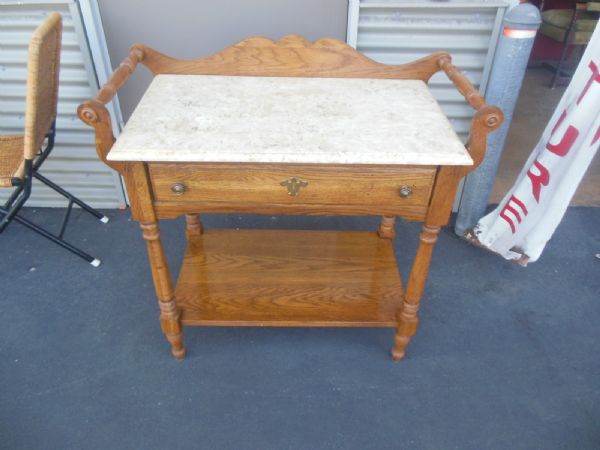 34'' x 19'' x 36''H Yellow Marble Topped Oak Server Stand w/Brass Fittings.
