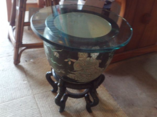 20''dia x 21''H Table - Green Patina Pot w/Green Stand and Thick Glass Top.