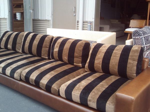 139''L x 38''D Brown Leather Sofa w/Black & Brown Striped Cushions.