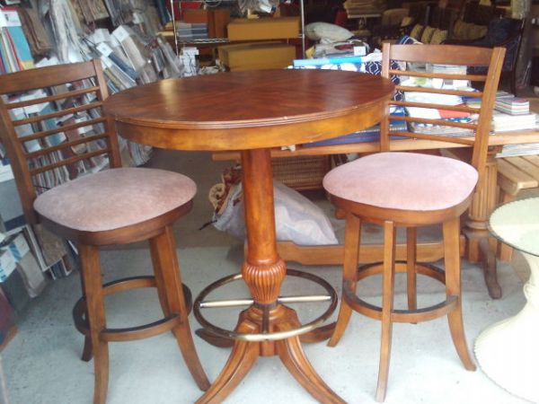 Pub Table Set - 36''dia x 48''H Table with Footrest, Two 32''H Swivel Barstools.