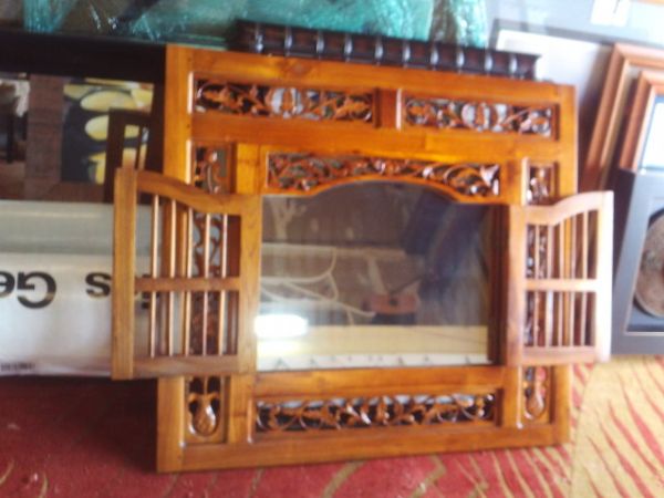 31.5'' x 35.5'' Carved Indonesian Mirror Behind Doors.