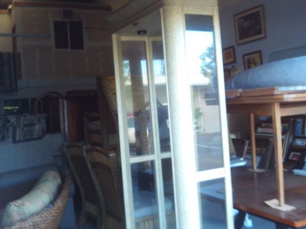 92''H x 48''W x 16''D Melrose Display Cabinet - Clear Mirror Back, 3 Glass Shelves, Satin Nickel Hardware - Glazed Silver Leaf.