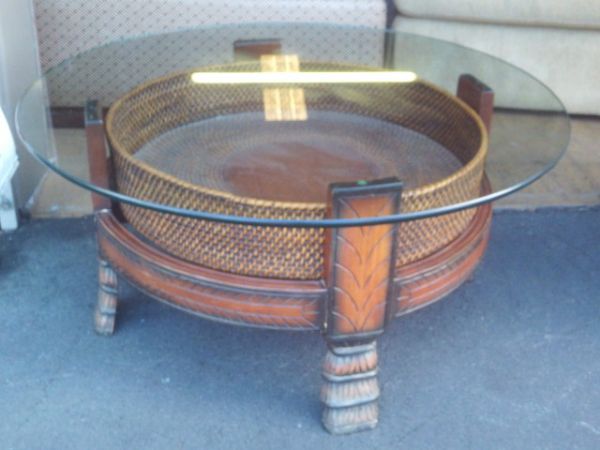 Wood and Basket Coffee Table w/Round Glass Top - 36''dia x 17''H.