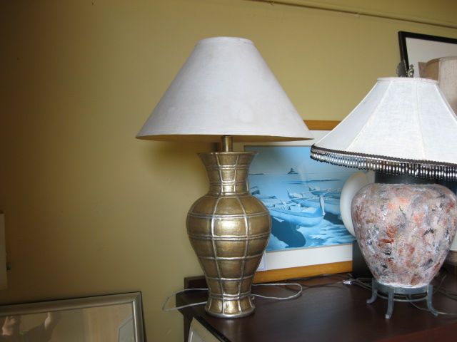 Gold ceramic lamp stands 35'' tall and has a diameter of 10'' at the bottom of the shade.