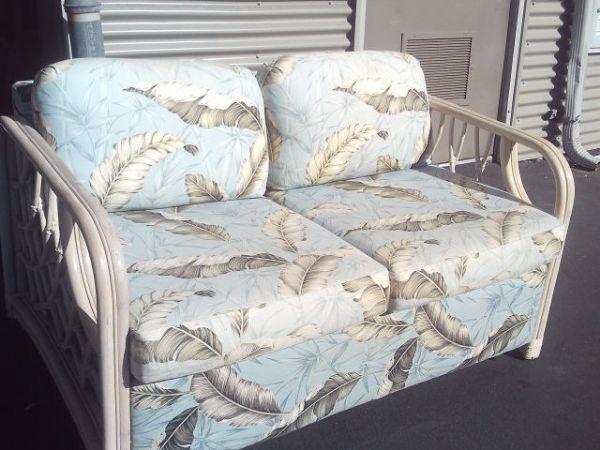 Whitewashed Rattan Loveseat w/Light Blue Tropical Upholstery.