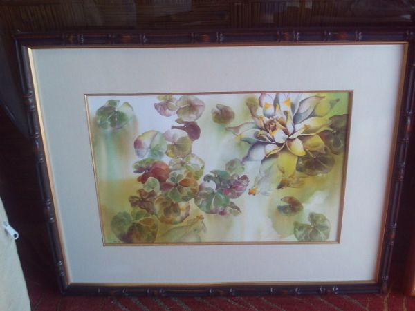 31''W x 24.5''H Asian Style Koi and Lotus Watercolor in Faux Bamboo Frame.