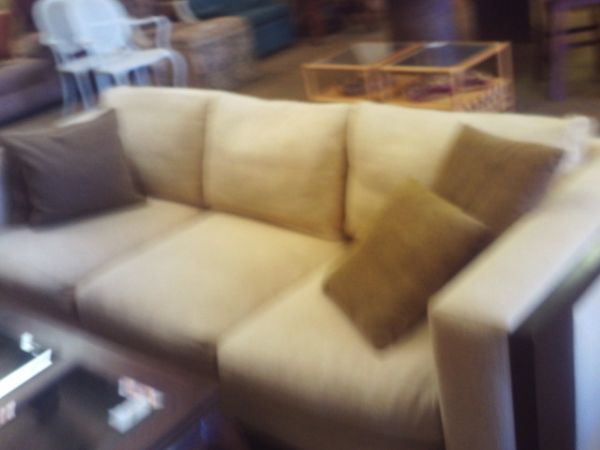 Off White, Contemporary, High End Sofa w/Wood Trim - 97''L x 26''H x 35''D.