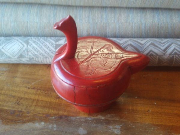 6'' Antique Chinese Red Lacquer Teapot Shaped Bowl w/Lid - Cracked.