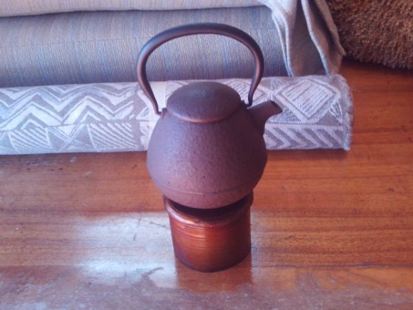 Small, Black Cast Iron Teapot on Bamboo Stand w/Infuser.