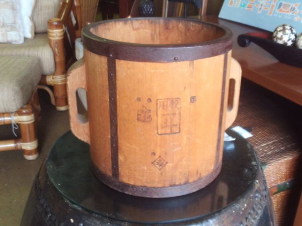 Asian Wooden Bucket w/Metal Straps and Integral Handles.