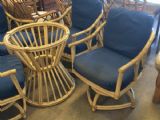 SET OF 5 pcs -- FICKS REED brand. Rattan dining room set with swivel rocking chairs. Sunbrella fabric. Very comfy. Base can take 48'' glass..