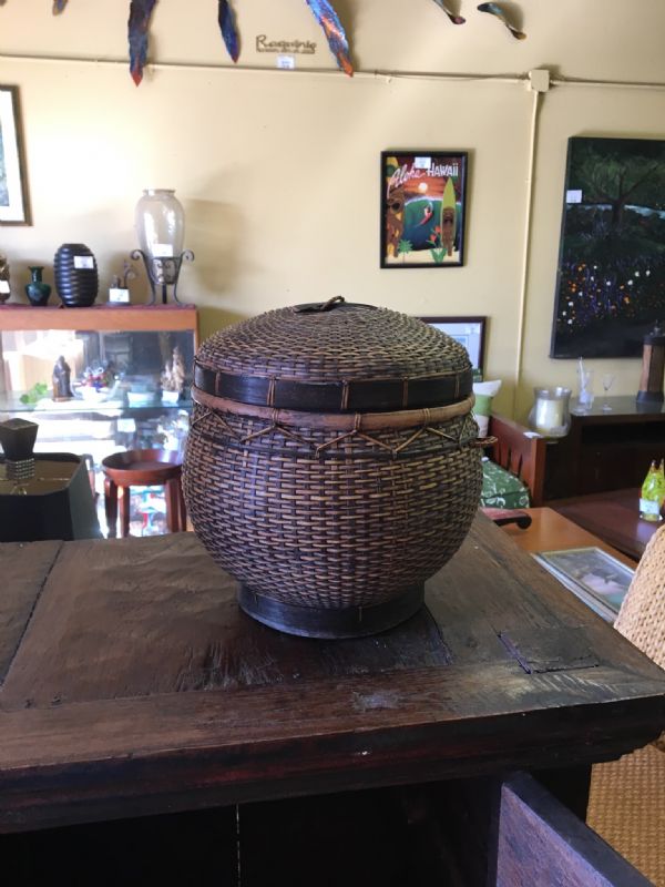 Woven basket with lid 12'' diameter.