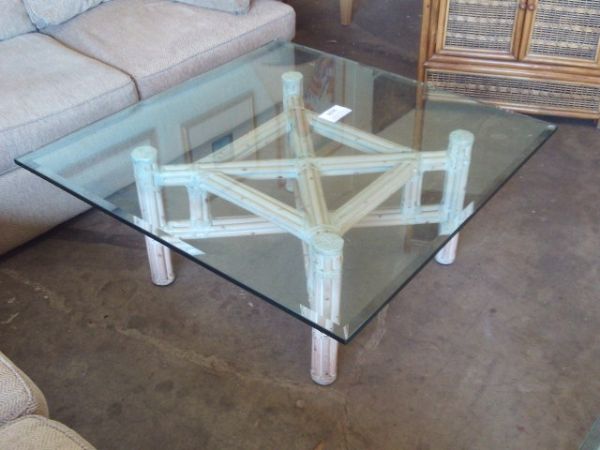 MCGUIRE. Rattan Glass Top Coffee Table Square w/ beveled glass, Antique White - 42x42x18.5 .