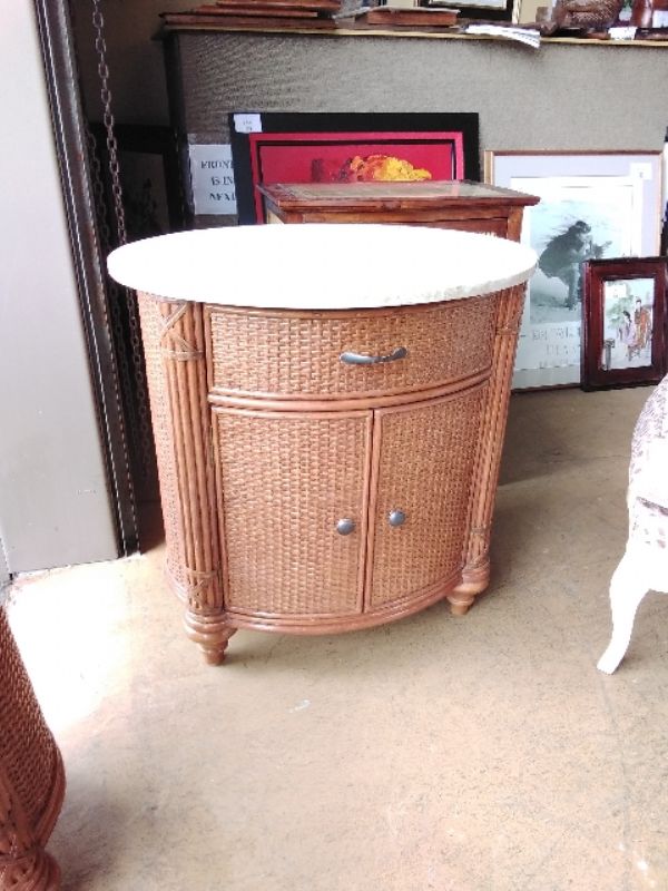Stone top wicker and rattan mocha color nightstand w/ drawer and doors.