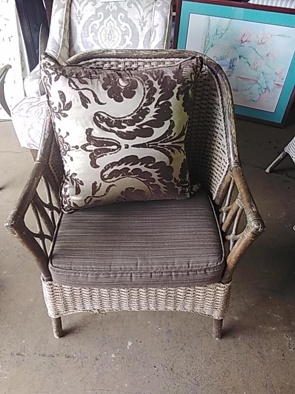 Outdoor McGuire/Baker wicker chairs with sunbrella cushions - price for each.
