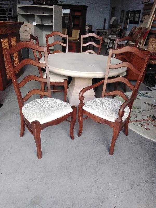 SET OF 6 -- dining room chairs. Dark wood. 4 armless, 2 w/arms. .