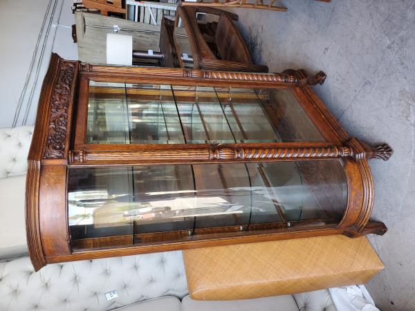 Antique Display cabinet with glass doors and glass shelves with carved wood decor.