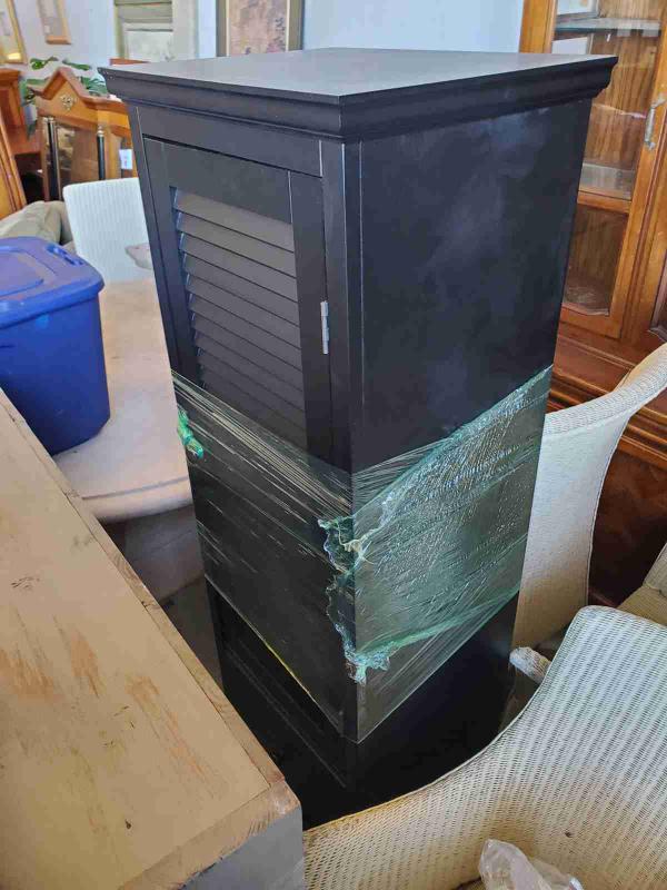 Tall black cabinet with door and 2 drawers.