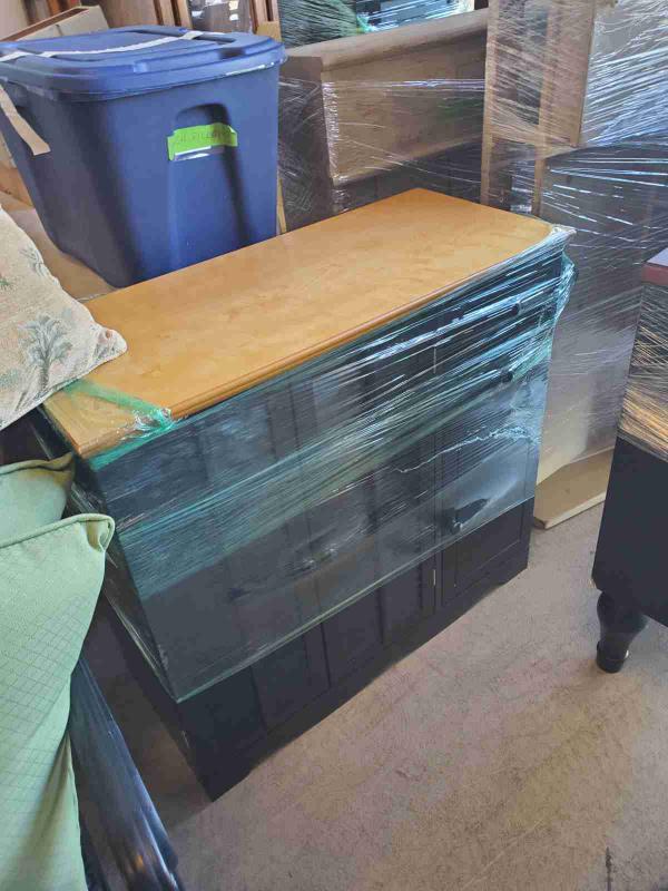 Small 3-door, 2 drawer cabinet. Black w.wood top.