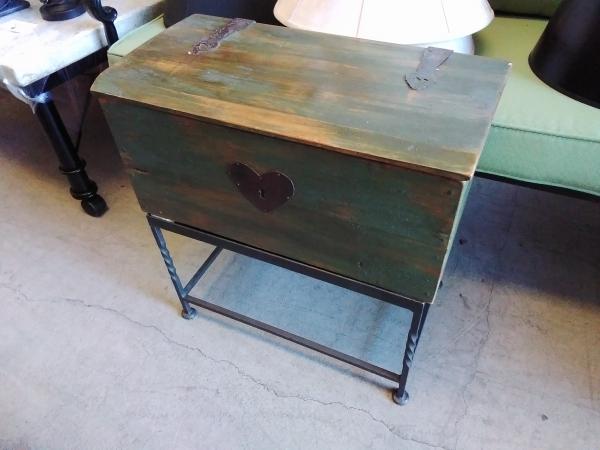 Rustic dark green chest on metal legs with heart shaped lotches.