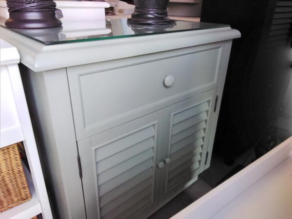 Teal table cabinet with 2 doors and glass top.