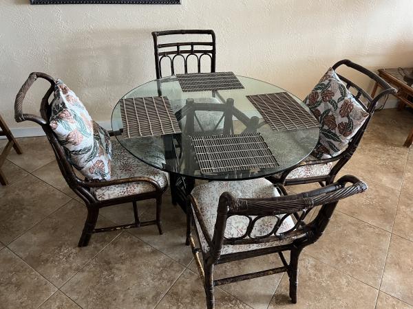 Rattan dining table 48'' round 3/4'' thick glass.