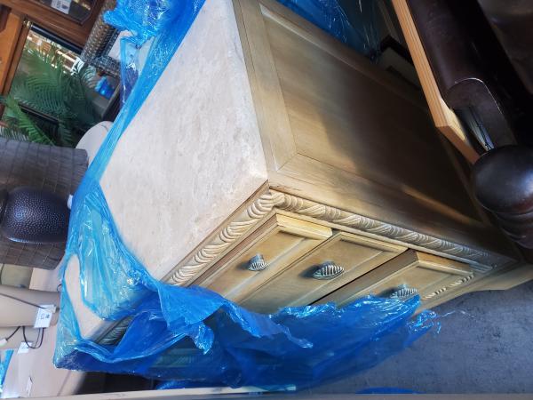 3 drawer dresser Stone top Oak and Rattan.