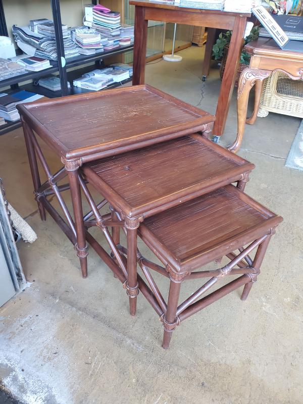 3 End tables set With Bamboo top, leather binding and woven wicker.