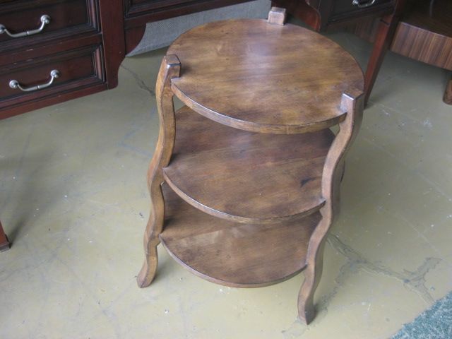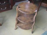 Three tiered round side table solid wood. The height is 28'' tall and the graduating tiers measure 18'' diameter on the bottom shelf, 17'' diameter on the center shelf, and 15'' diameter on the top shelf.